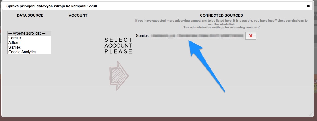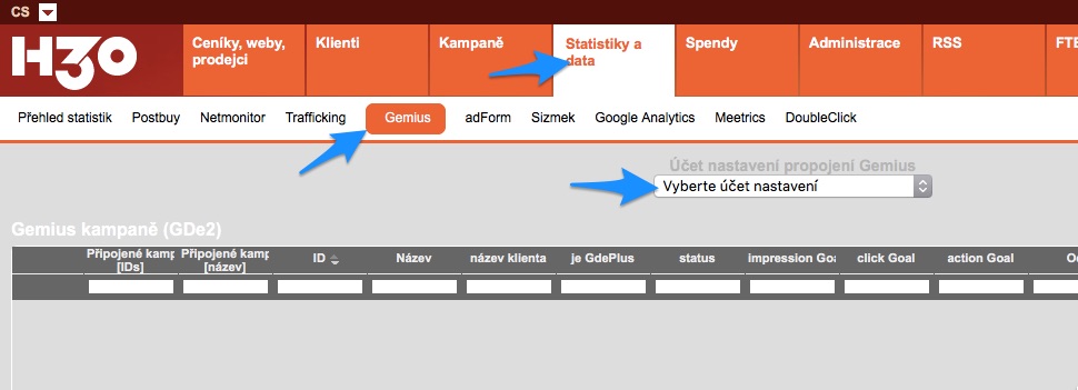 3 – komplikovanější hledání kampaně v adservingu – pokud si nejste jisti kampaní a placementy, které chcete s H3.0 kampaní propojit, můžete se dostat do dat adservingu pomocí menu Statistiky a data / název adservingu. Po výběru loginu (účet nastavení), který chcete použít se vám zobrazí seznam všech kampaní, které pod daným loginem v daném adserveru jsou.