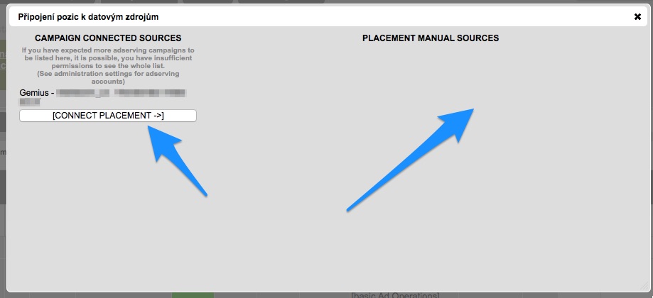 Okno, které se objeví, má dvě části. V té pravé jsou placementy adserveru, které jsou manuálně napojeny na danou pozici H3.0 kampaně. Nemusí tam být nic. V levé části okna jsou všechny datové zdroje napojené na naši kampaň. U adserveru, který chcete manuálně propojit klikněte na CONNECT PLACEMENT.