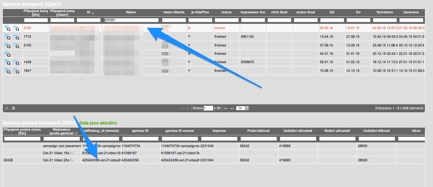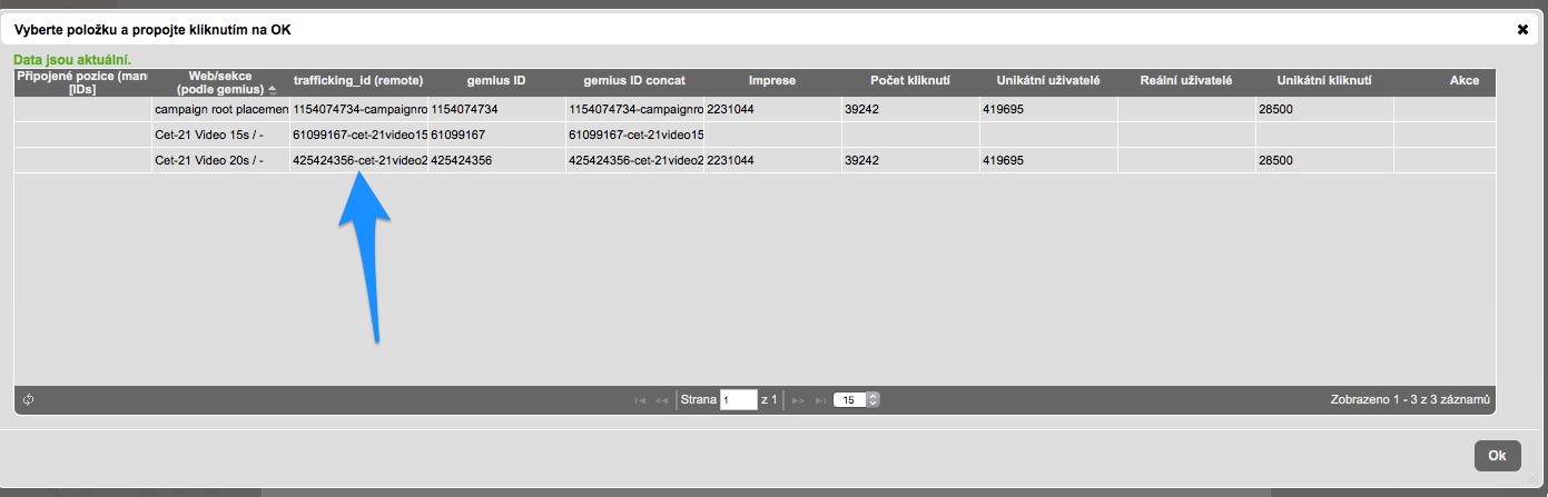 Když kliknete na název kampaně v seznamu kampaní, objeví se v tabulce pod tímto seznamem seznam placementů = pozic kampaně tak, jak jsou zadány v adserveru, spolu se statistikami těchto pozic. Ve sloupci trafficking_id[remote] jsou trafficking ID tak jak jsou zadány v adserveru.