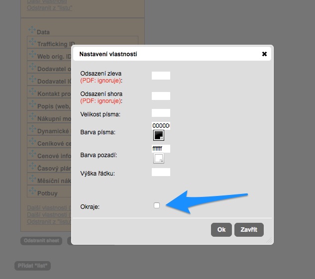 Tato volba se zapíná v editaci daného exportu (Administrace/Export tuner – kliknout na název exportu v levém sloupci) ve vloženém modulu Data je pod seznamem sloupců sekce Data odkaz Další vlastnosti (záhlaví) a Další vlastnosti (výpis). Po kliknutí na tyto odkazy je možné pomocí checkboxu Okraje zapnout/vypnout okraje záhlaví nebo výpisu dat pro daný export.