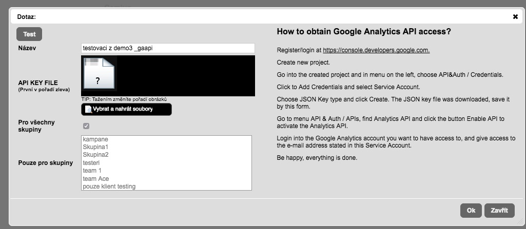 Podrobný návod k tomu co nově vyplnit máte pro DoubleClick (DCM) i pro Google Analytics (GA) přímo v editaci jednotlivých loginů pro každý ze systémů. Povětšinou se jedná o to, že je třeba zadávat méně informací, zato se nově importuje takzvaný JSON soubor. Ten nahradil některé kolonky v loginech i .p12 soubor, který se používal dříve.