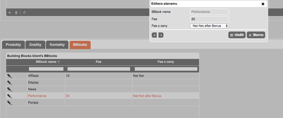 – pod tabulkou se seznamem klientů je další tabulka, která se aktualizuje podle toho jaký klient je v hodní tabulce vybraný – v této tabulce klikněte na záložku BBlocks – uvidíte seznam defaultních BB. Kliknutím na ikonku tužky v řádku patřičného BB můžete naeditovat hodnotu % fee i jeho základ