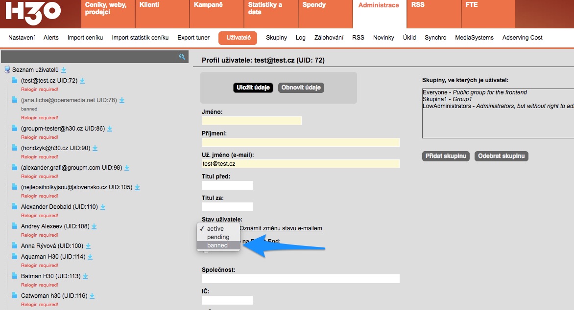 - PullDown “Stav uživatele” změnte hodnotu na “banned”