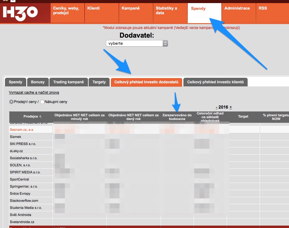Když chci vědět, kolik udělám do konce roku na Seznamu, nebo kolik tam mám zarezervováno, mohu použít modul Spendy, záložku Celkový přehled investic dodavatelů. V ní je velká tabulka uvádějící aktuální spendy (dle stavu Objednáno, Objednávka potvrzena), částky v rezervacích (dle stavu Rezervace, Rezervace potvrzena) – sloupec Zarezervováno do budoucna a podle těchto částek se systém pokouší odhadnou investice na daném dodavateli do konce roku.