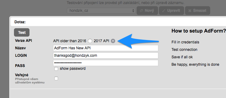 Přechod na novou API je jednoduchý – v Administrace/Nastavení/Propojení s ostatními systémy si v sekci AdForm naeditujte nebo vytvořte login, který je kompatibilní s novou API (děcka z AdFormu vám řeknou jestli jo nebo ne) a u něj naleznete nové přepínátko, které přepněte do polohy 2017 API.