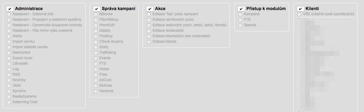 Nastavení práv přístupu pro každou z podzáložek v hlavním editačním modulu mediaplánu – Správě kampaně.