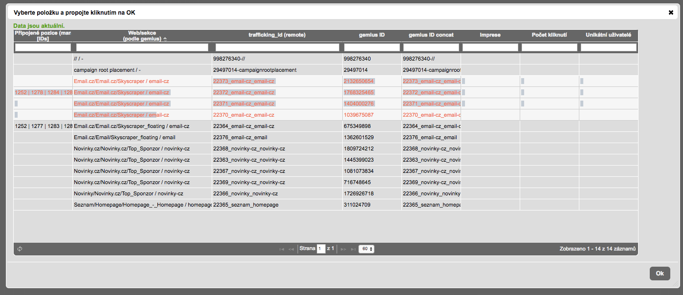 • v tabulce se seznamem řádek datového zdroje (např. placementy adservingu) jde nyní vyhledávat – v horní části jsou vyhledávací pole jakou jsou například v ceníku