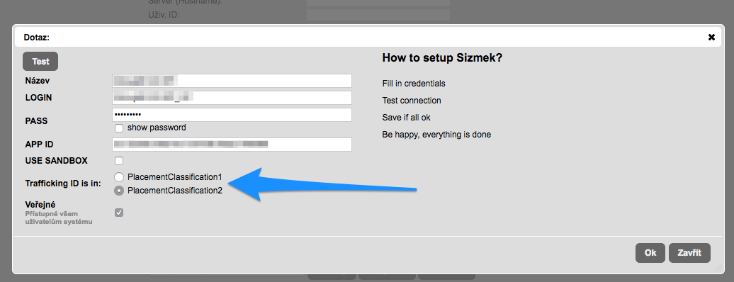 Trafficking ID je možné do Sizmeku zadávat buď do pole “placement Classification”, nebo “placement Classification 2”. To, které pole bude použito je poté nutno označit u údajů o loginu v Administrace / Nastavení / Propojení s ostatními systémy – Sizmek – editace patřičného loginu.