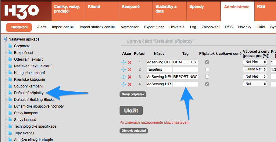 TAGy příplatku je možné (a velmi to doporučujeme) zadat již k defaultním příplatkům: