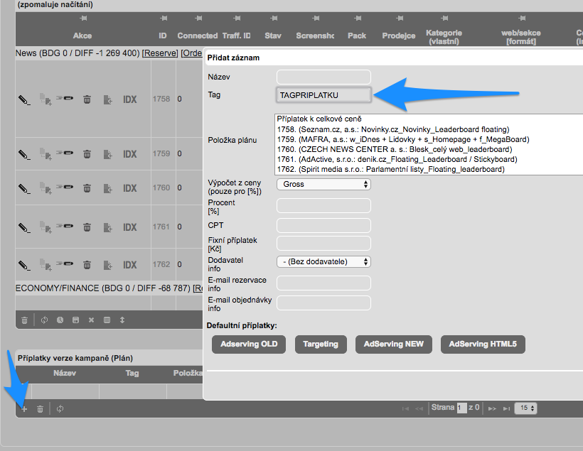 TAGy příplatku se zadávají při zakládání při editaci příplatku v kampani: