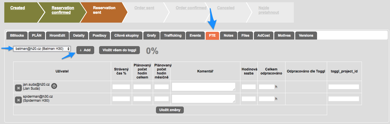 Pro sledování počtu odpracovaných hodin na jednotlivých projektech používá H3.0 automatické napojení na systém Toggl.com. Toto napojení je přes API (= automatické) a u Toggl.com k tomu stačí free účet.
