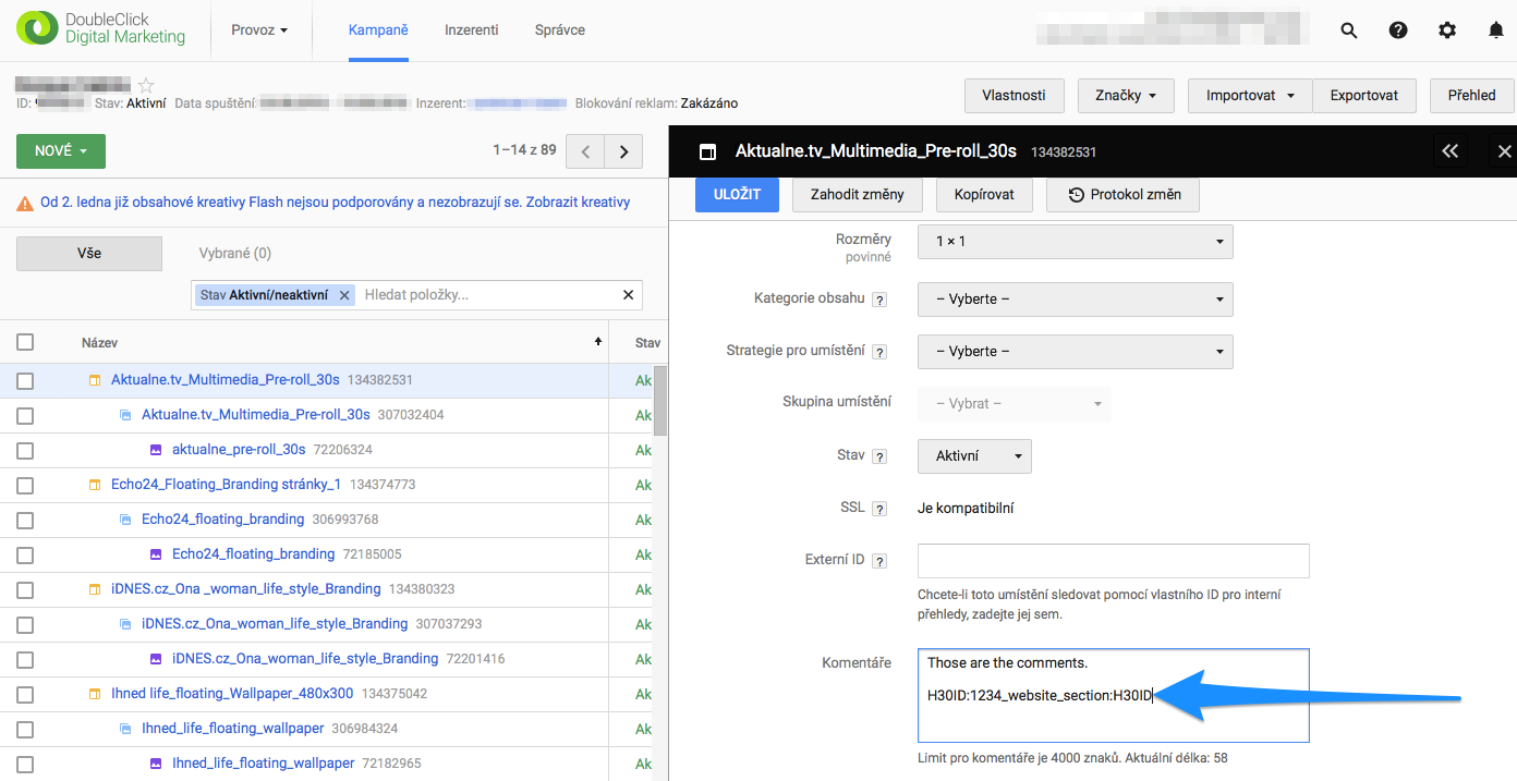 Within DCM, Trafficking ID shall be put into Placement COMMENTS field, within the mask “H30ID:traffickingID:H30ID”. So for example, if trafficking ID is “1234_website_section”, you shall put “H30ID:1234_website_section:H30ID” into the Placement Comments.