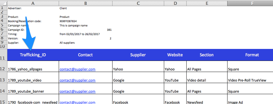 Trafficking ID looks like “1234_website_section” and is placed in trafficking sheet table. Example below: