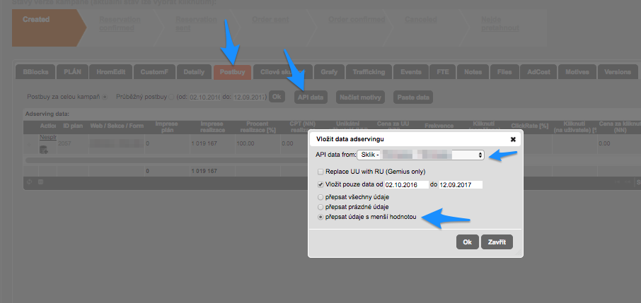 Poté, co máme Sklik kampaně propojeny s pozicemi kampaně v H3.0, můžeme si načíst data do Postbuy. Ve Správě kampaně klikněte na záložku Postbuy a v ní na tlačítko API data. V PullDownu API data from vyberte patřičný login a možnost co se stane se současnými daty kampaně (asi vyberete přepsat ůdaje s menší hodnotou) a klikněte na OK. Poté se data z Skliku načtou do Postbuy kampaně a je možné s nimi dále pracovat.