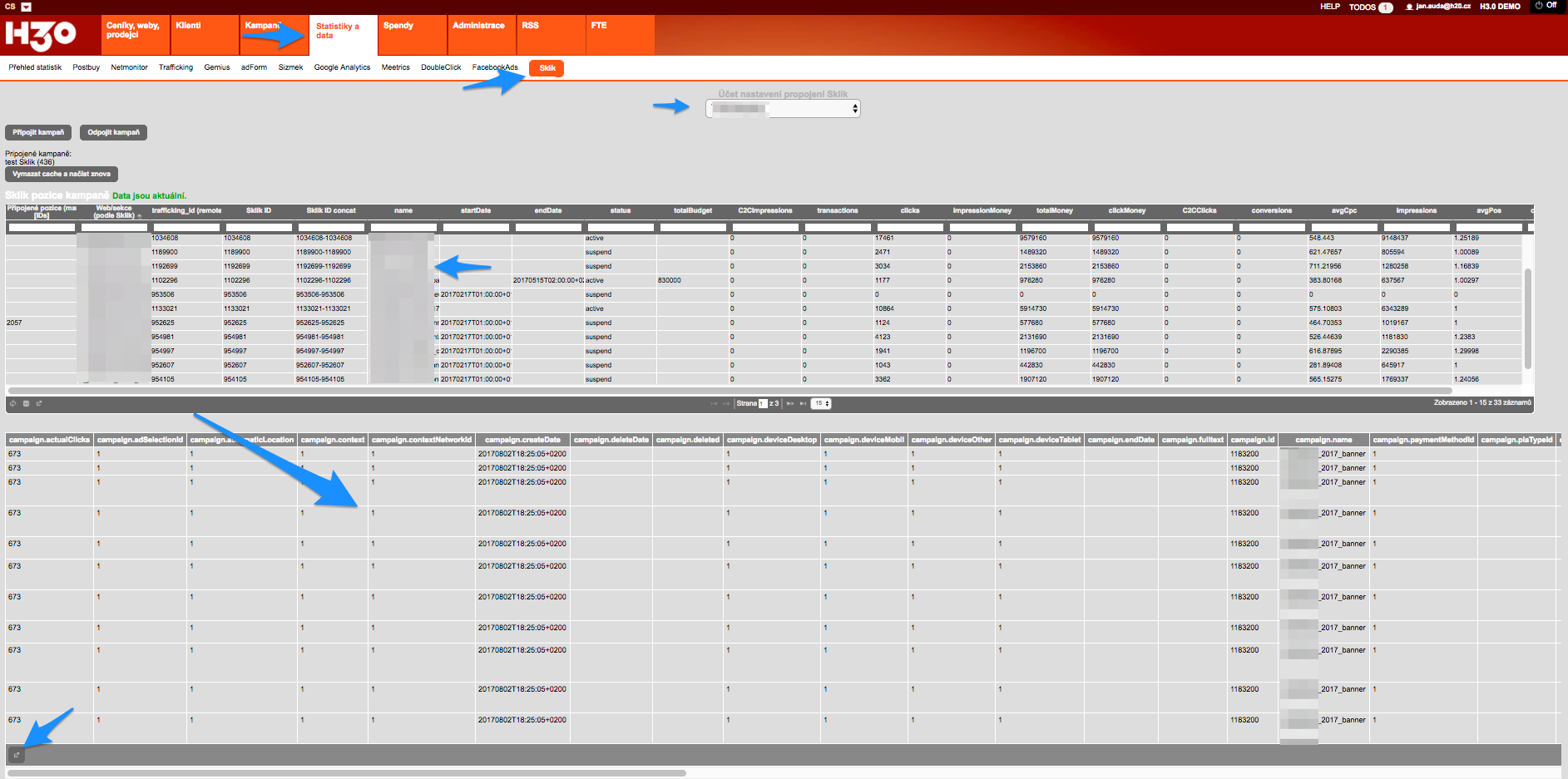 - Propojení klasicky funguje tak, že pokud je na jeden placement v H3.0 kampani více kampaní v Skliku, metriky se sečtou. Zároveň, k jedné H3.0 kampani je možné připojit libovolné množství Sklik účtů a Sklik kampaní