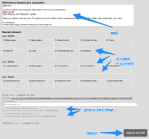 - Seznam partnerů / dodavatelů, kterým zašleme mail, a u každého možnost zaškrtnout, které pozice jim do crowdu k vyplnění pošleme.