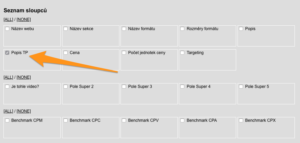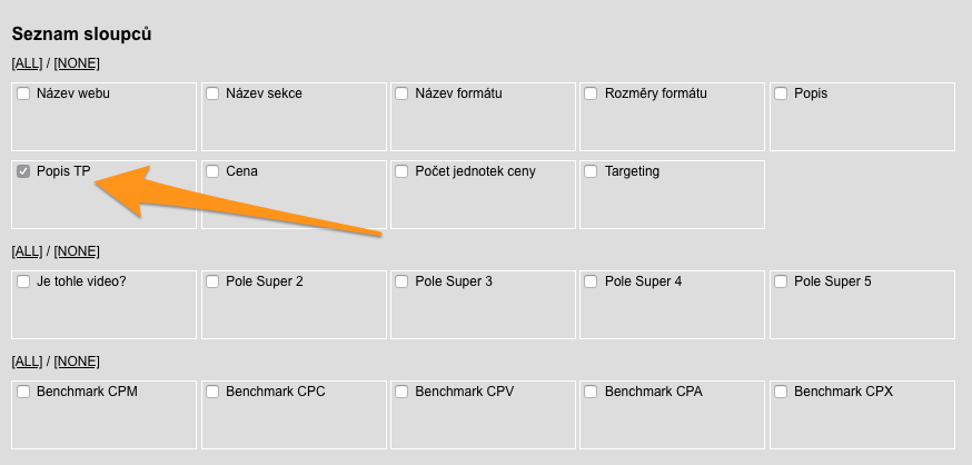 - seznam sloupců plánu, které po něm budete chtít vyplnit (nepřehlcujte je, nebo to začnou inforovat :-)). Sloupce jsou zobrazeny ve 3 sekcích: Popisné sloupce, Custom agenturní sloupce a Benchmarky.