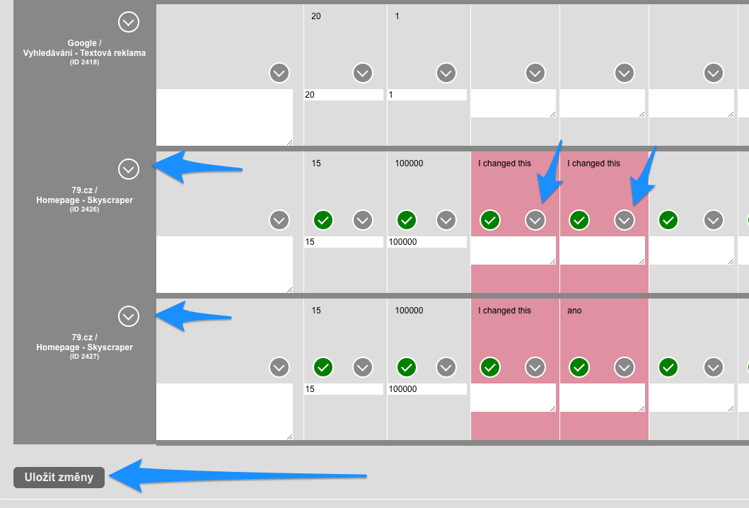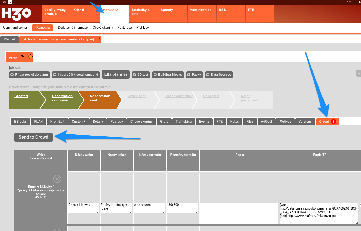 Každý placement v záložce Crowd má dvě řádky. V horní řádce jsou informace vyplněné dodavatelem přes Crowd. V dolní je pak editační pole s H3.0 informacemi o placementu. Data z Crowdu je možné převést do H3.0 editačního pole buď šipkou u jednotlivých sloupečků, nebo šipkou pro každý placement, která takhle vyřeší všechny sloupečky jednoho placementu.