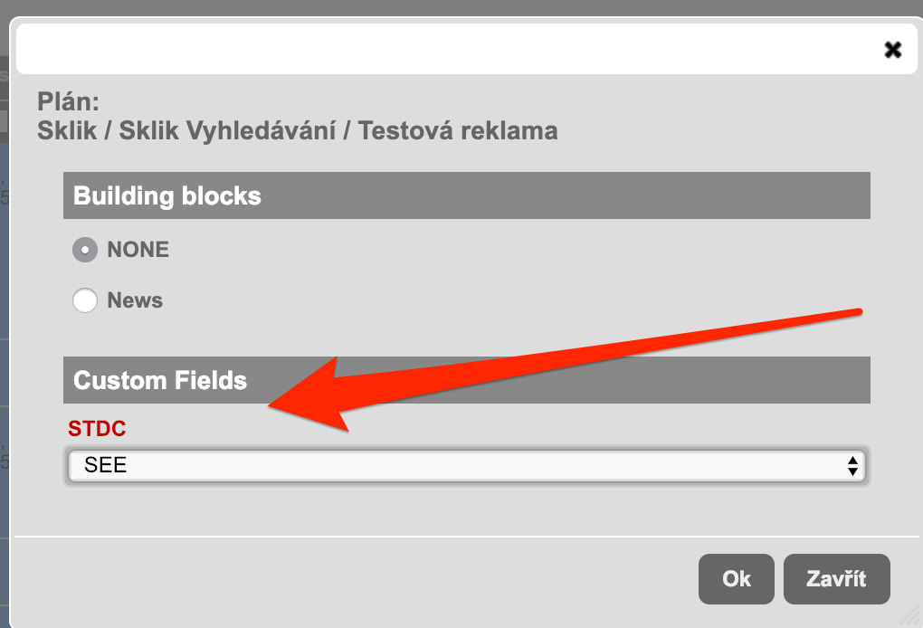 Pokud chcete, aby bylo možné vložit hodnotu daného CF hned při vkládání pozice do kampaně, zaškrtněte sloupec Zobrazit při vkládání pozice do kampaně. Volba se pak objeví v “modal” okně zobrazeném po kliknutí na tlačítko přidání pozice do kampaně.