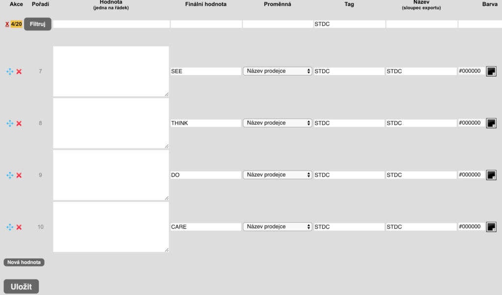 Ony hodnoty, kterých pak může PullDown nabývat zadejte pod zvoleným tagem do Administrace/Nastavení/Dynamické sloupcové hodnoty. Hodnotu CF zadejte do Finální hodnota, do Hodnota nemusíte zadávat nic.