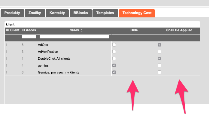pokud dané CF používá pouze vybraný klient, odškrtněte checkbox ve sloupci Viditelné pro klienty a pomocí tlačítka Vybrat klienty vyberte ty klienty, pro které je dané CF platné.