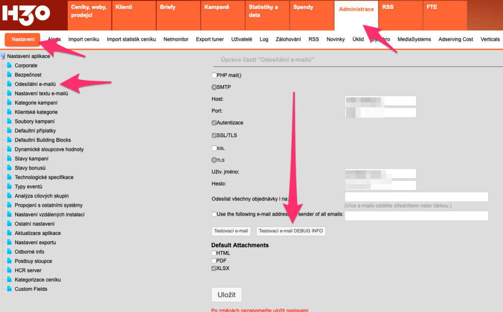 V Administrace/Nastavení/Nastavení odesílání e-mailů je tlačítko “Testovací e-mail DEBUG INFO”. Po kliknutí na něj odešlete e-mail na zvolenou adresu a poté se vám vypíšou detailní hlášky z komunikace H3.0 s mailserverem abyste mohli zjistit, jestli tam došlo k nějakému problému a v čem.