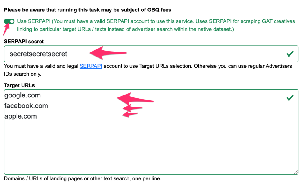 Checkbox “Use SERPAPI” – tento checkbox zaškrtněte pokud chcete vyjet data pro vyhledávání cílových domén nebo textů reklam.
