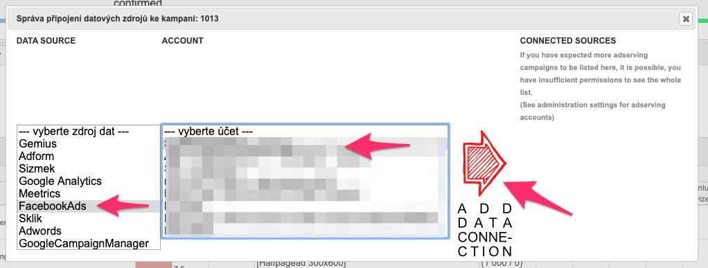 2. vyberte v levém sloupci DATA SOURCE zdroj dat, který chcete propojit. Po kliknutí se vám ve sloupci ACCOUNT objeví všechny loginy, které pro daný systém v H3.0 máte. Vyberte patřičný login a klikněte na zčervenalou šipku ADD DATA CONNECTION.