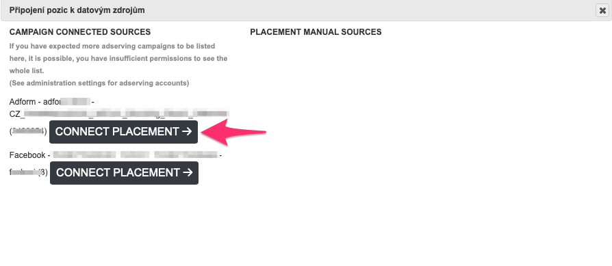 Otevře se vám okno se seznamem externích kampaní připojených k dané H3.0 kampani. Klikněte na tlačítko CONNECT PLACEMENT -> u té kampaně, jejích elementy chcete k H3.0 placementu připojit.