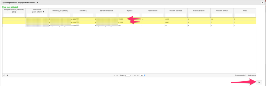 Otevře se vám okno s elementy kampaně v externím systému. Tedy například s Line Items Adformu, nebo kampaněmi v Meta. Více o funkcích v této tabulce je zde, nicméně vaší základní funkcí bude označit ten element externí kampaně (nebo se Shiftem více elementů), který chcete napojit na patřičný řádek H3.0 kampaně. Po označení klikněte na OK.