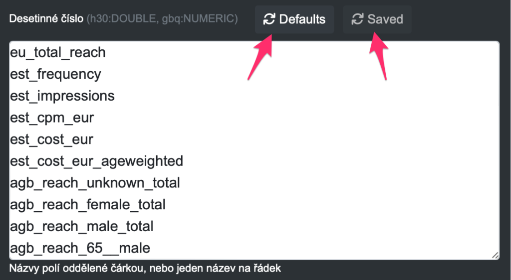 Pokud kliknete na tlačítko “Default” u daného pole formuláře, vloží se do daného pole námi předvybrané názvy sloupců. Pokud poté kliknete na tlačítko Saved, vrátí se do pole hodnoty, které máte aktuálně u DataTasku uložené.