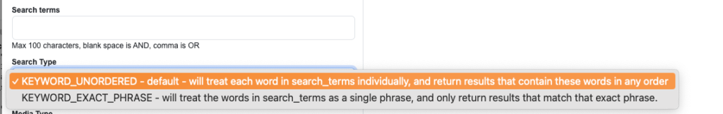 tato volba způsobí, že každé slovo v Search terms bude bráno individuálně a vrátí výsledky, které obsahují tato slova v jakémkoliv pořadí