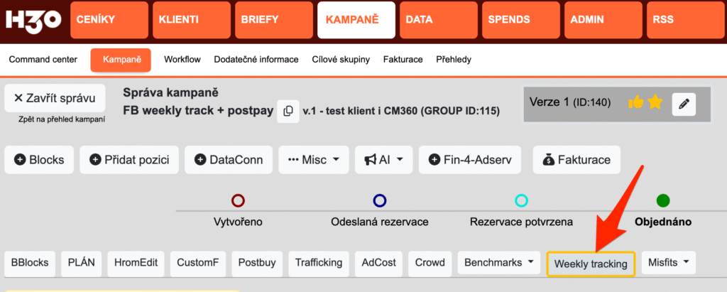 Poznámka: modul weekly track obsahuje data z externích zdrojů. Aby se vám ty data v kampani objevily, musíte kampaň napojit na externí zdroje statistik. Návod je zde: http://wiki.h30.digital/jak-stahnout-statistiky-do-postbuy-z-externiho-zdroje/postbuys/