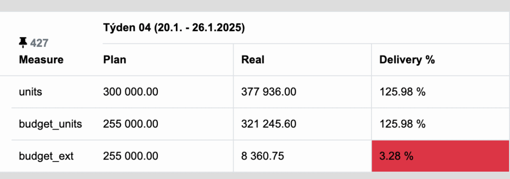 budget_ext / Plan = to samé jako budget_units / Plan, tedy naplánovaný rozpočet dle H3.0 v daném týdnu