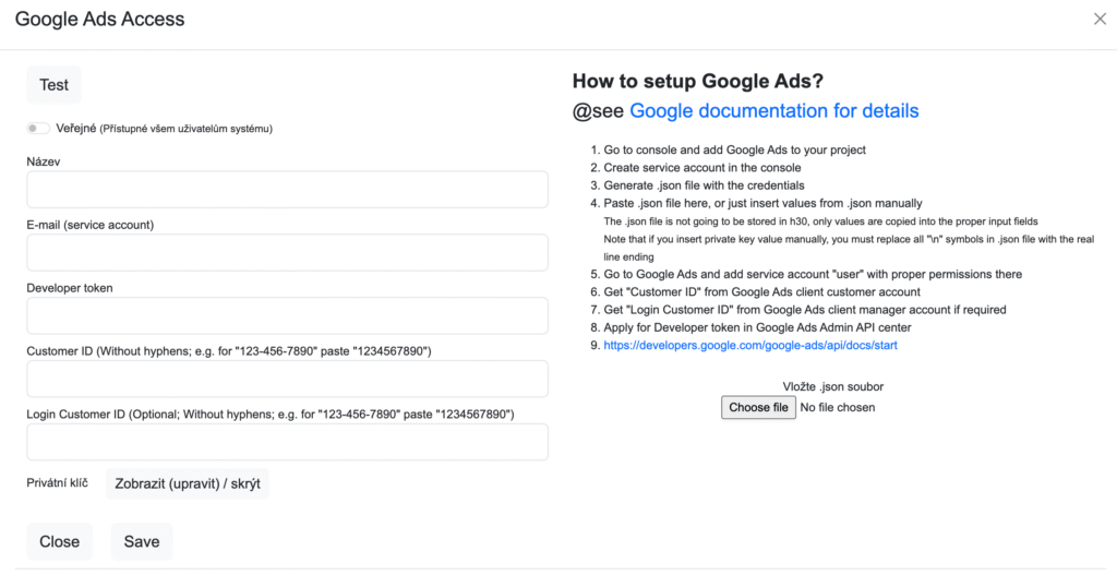Nyní můžete v H3.0 uložit formulář s Google Ads loginy a pokud máte potřebný Google Ads access, můžete kliknout na tlačítko Test.