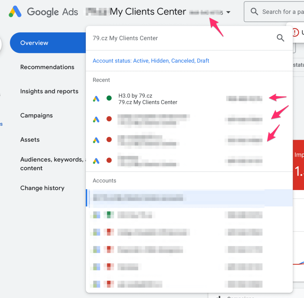 Pokud používáte přístup přes MCC, potřebujete z Google Ads dvě čísla Google Ads účtů, jsou to taková ty čísla oddělená pomlčkou typu 111-111-1111. Jsou vidět například v PullDown menu s výběrem účtů co je uprostřed nahoře.