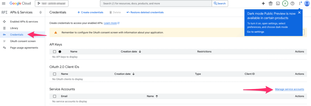 Nyní vytvoříme přístupy – klikněte na menu Credentials v levém sloupci a v sekci Service accounts klikněte na odkaz Manage service accounts