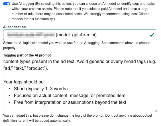 Tagging part of the AI prompt – toto textové pole obsahuje instrukční část promptu, který posílá směrem do AI texty reklam k otagování. Tyto instrukce můžete upravit. Můžete zde i vypsat (prompt stylem) výslovná témata či produkty, které chcete tagovat.