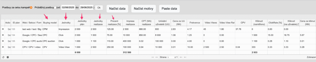 2. hned za těmito sloupečky jsou další, které ukazují jak se pozice splnila a tedy: Jednotky plán (počet jednotek v mediaplánu), Jednotky realizace (kolik jednotek ze sloupce Jednotky je v Postbuy) a Procent realizace ukazuje poměr mezi dvěma předchozími sloupci. Žádný z těchto sloupců není editovatelný, vyplňují se do něj automaticky hodnoty z patřičných postbuy sloupců podle buying modelu placementu. Tedy například pro CPC buying model se do Jednotky realizace dá hodnota ze sloupce Kliknutí a pro buying model CPV ze sloupce Video Views