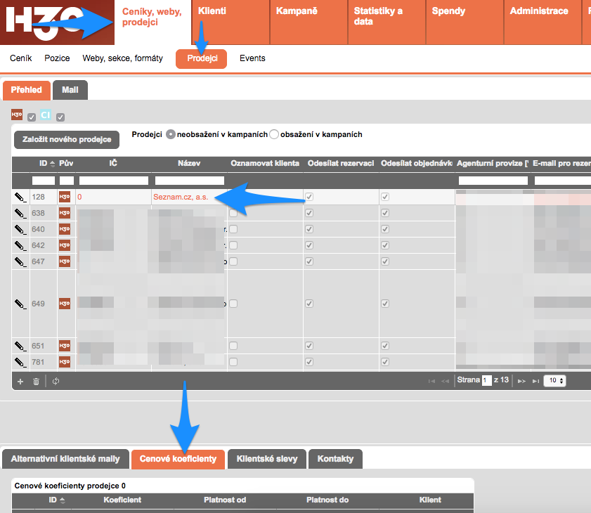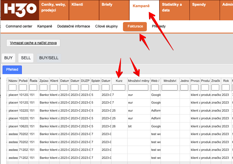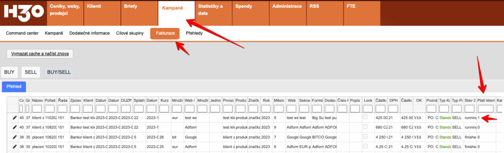 Informace o tom, že si klient platí položku kampaně sám se projeví v záložce Fakturace, kde je na to speciální sloupec. Částky, které si klient platí sám mají v tomto sloupci hodnotu 1.