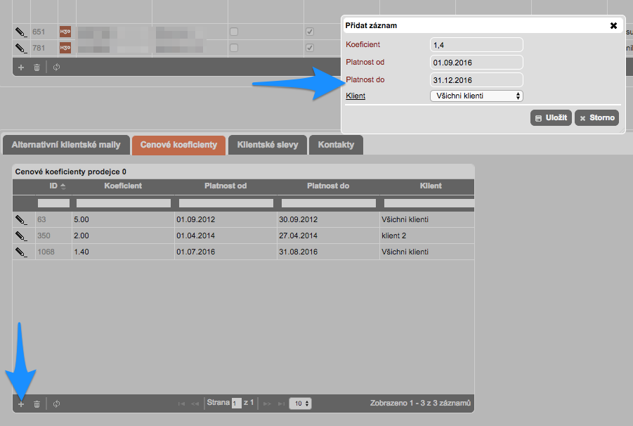 Nový koeficient se přidá kliknutím na + v patičce tabulky. Poté je možné zadat hodnotu koeficientu a data jeho platnosti. Je možné vybrat i zda bude koeficient platný pro všechny klienty, či pouze pro jednoho. Klientské koeficienty mají vyšší prioritu než obecné.
