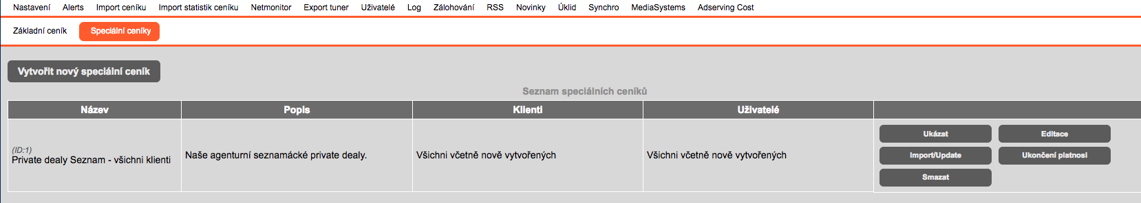 Timto se daný ceník založí a je možné s ním dělat spousty vylomenin, jako se na něj podívat, Uploadnout ho, Updatovat ho, Ukončit jeho platnost k patřičnému datu, nebo ho nedejbože Smazat. To vše pomocí tlačítek v řádce tohoto speciálního ceníku.