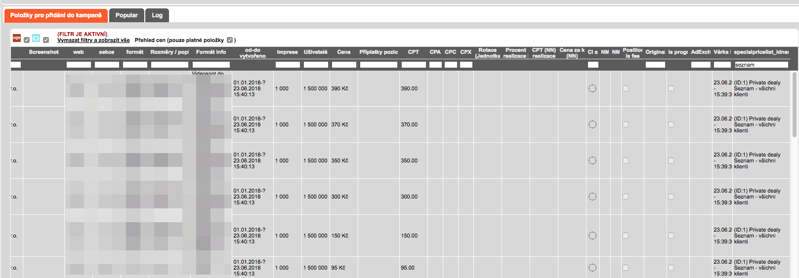 Při vkládání nové ceníkové pozice/položky je možné mít zaškrtnuto, že pozice je soukromá – takováto pozice je pak odlišena jinou barvou – používá se pro exkluzivně domluvené formáty dané agentury, klienta nebo plánovače.