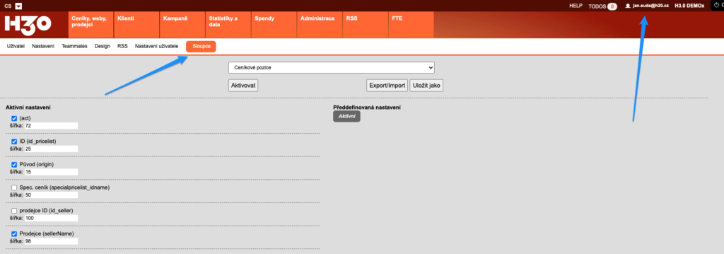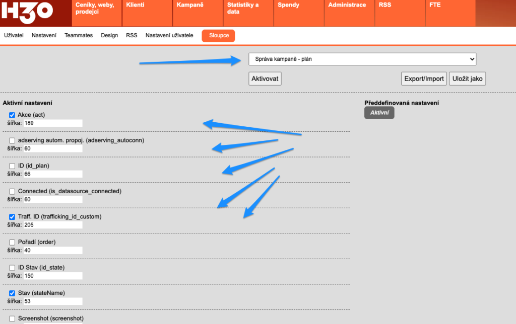 Viditelnost i šířku sloupců si můžete také nastavit číselně a přes checkboxy v Nastavení sloupců.