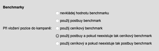 Po kliknutí na tuto záložku se vám zobrazí po řádcích pozice kampaně a ve sloupcích jednotlivé indexy Benchmarků. Tyto indexy se berou z ceníků a postbuy podle toho, jak je to zadáno v Administraci/Nastavení/Ostatní nastavení – sekce Benchmarky dole. Doporučujeme tam dát hodnotu viz screenshot níže:
