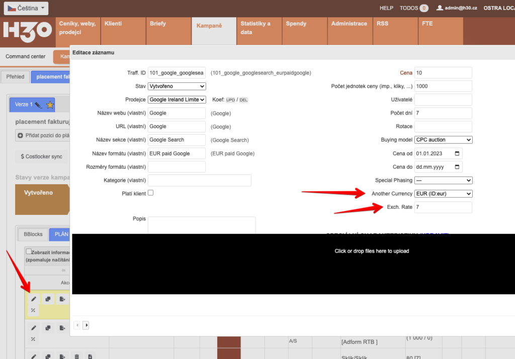 Po vložení položky do kampaně je možné měnu i kurs v rámci daného placementu kampaně editovat podobně jako v ceníku: