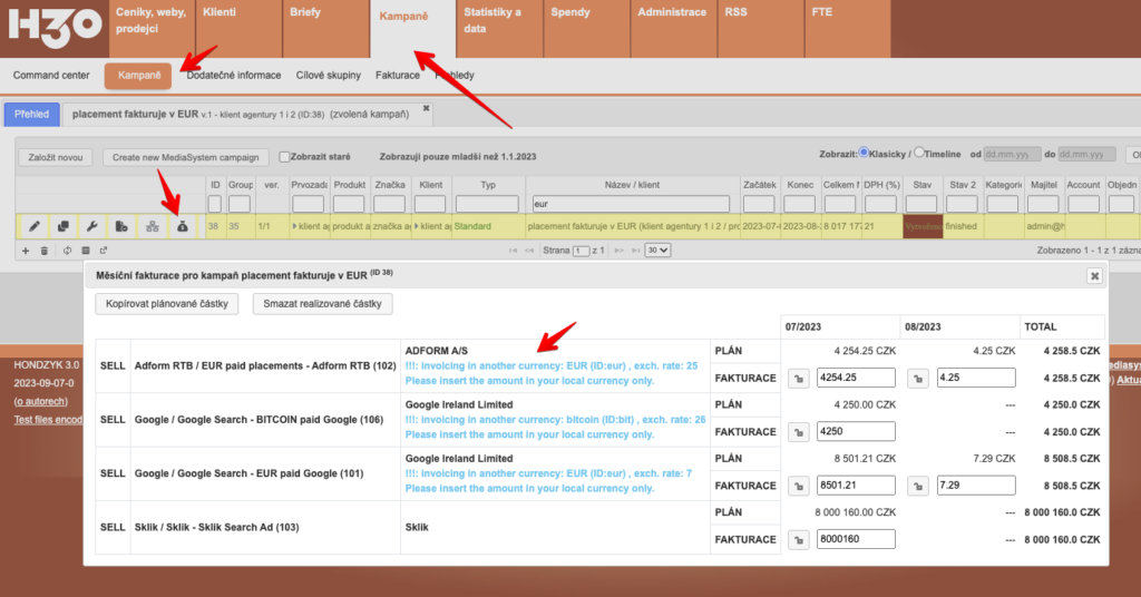 Informace o tom, že je placement fakturován v jiné měně je pak zobrazen v tabulce evidence měsíčních částek kampaně i v tabulce Fakturace: