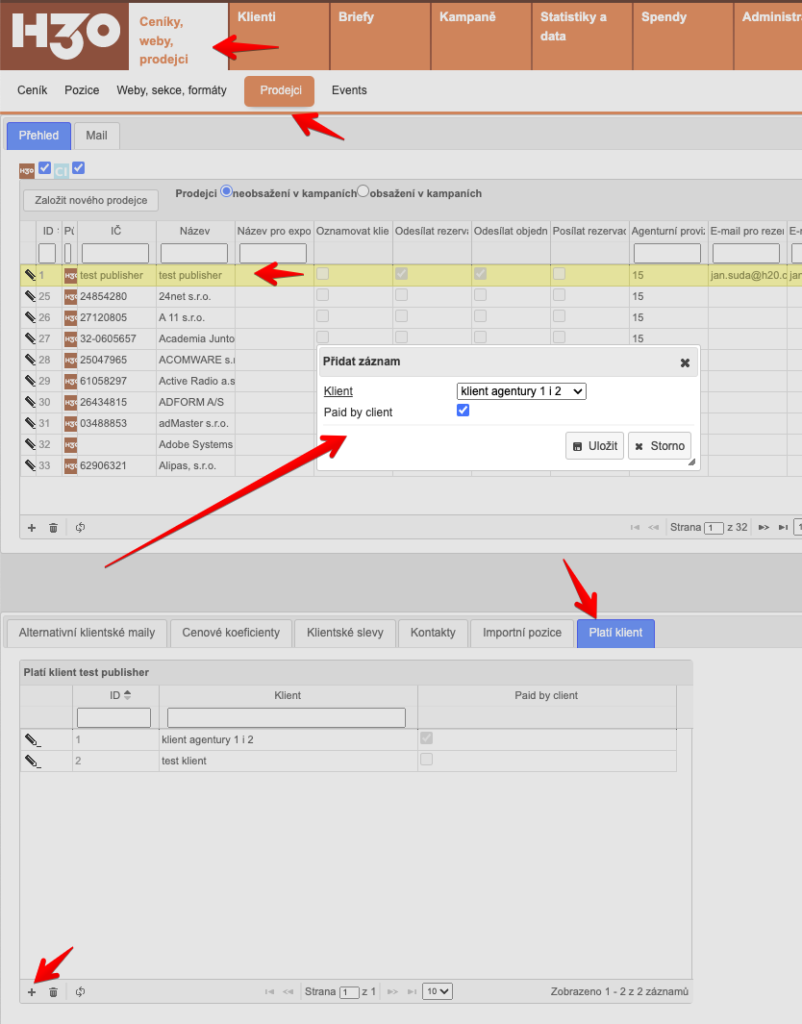 To, že si klient dodavatele (například Google), platí sám, si zaškrtnete v Ceníky, weby, prodejci / Prodejci. Vyberte dodavatele, v dolní souvztažné tabulce překlikněte na záložku Platí klient a pluskem v patičce tabulky můžete u tohoto dodavatele přidat záznam o klientovi, který si ho platí napřímo sám.
