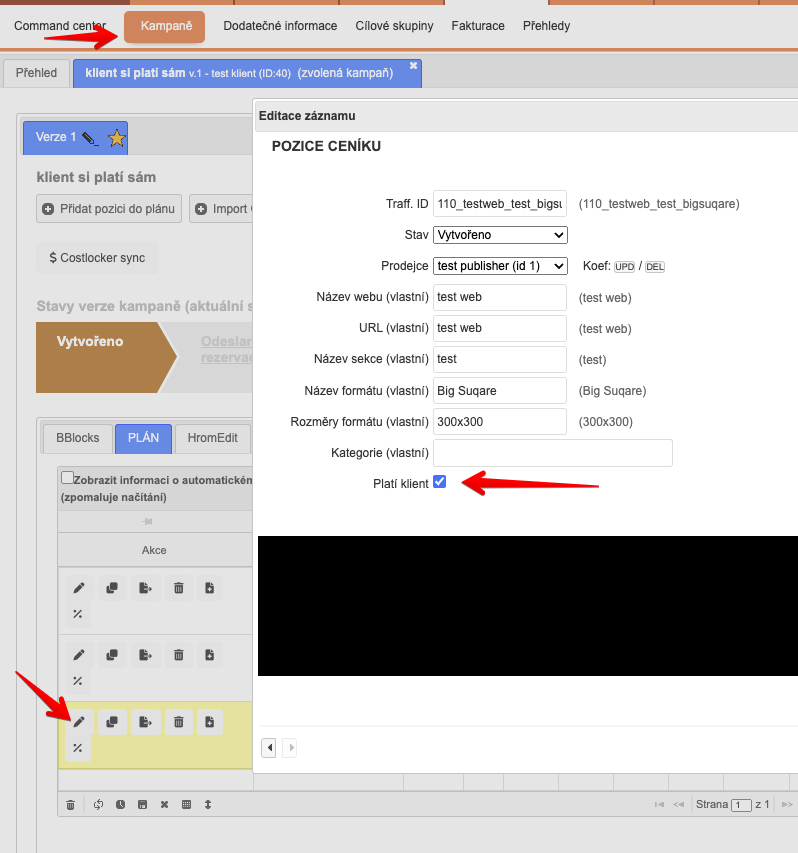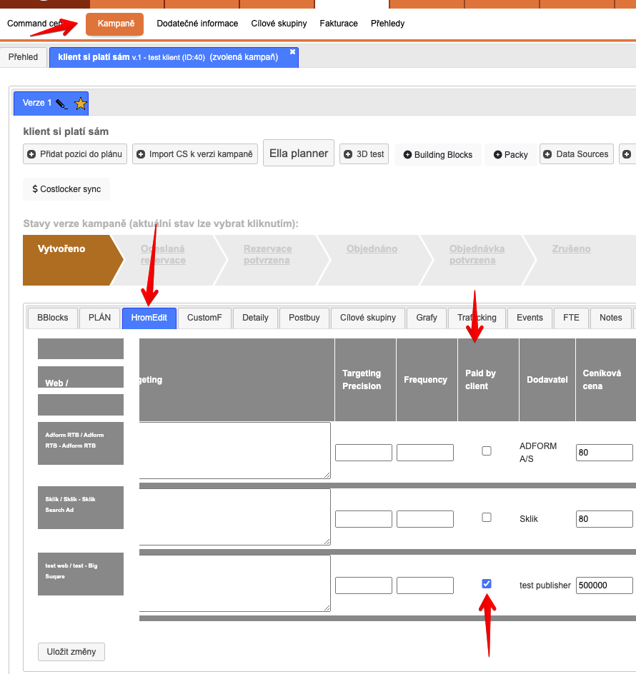 Když budete mít takto vztah dodavatele a klienta označen, bude se od teď při vkládání položek tohoto Dodavatele do kampaní tohoto Klienta u těch položek označovat, že si je klient platí sám. Plánovač pak ve Správě kampaně může označit i odznačit, že je patřičná položka placena napřímo klientem či nikoliv, a to buď v editaci placementu kampaně ikonkou tužky, nebo v Rozšířeném Hromeditu.