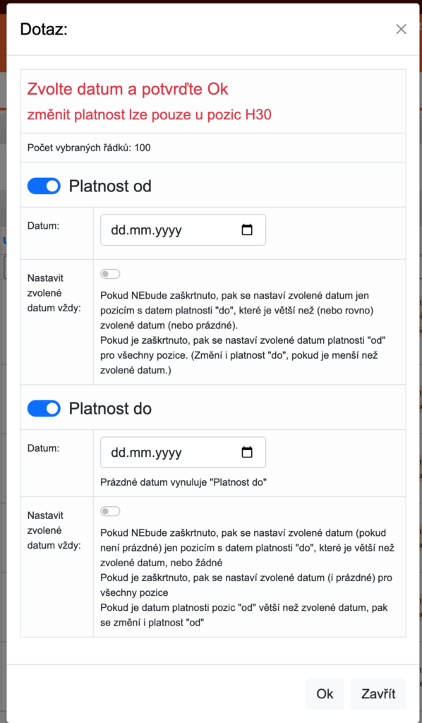 V objevivším se okně je možné vybrat, které datumy se budou měnit a možnost změny datumu u všech pozic versus u pozic s nižším datumem než je ten nový.